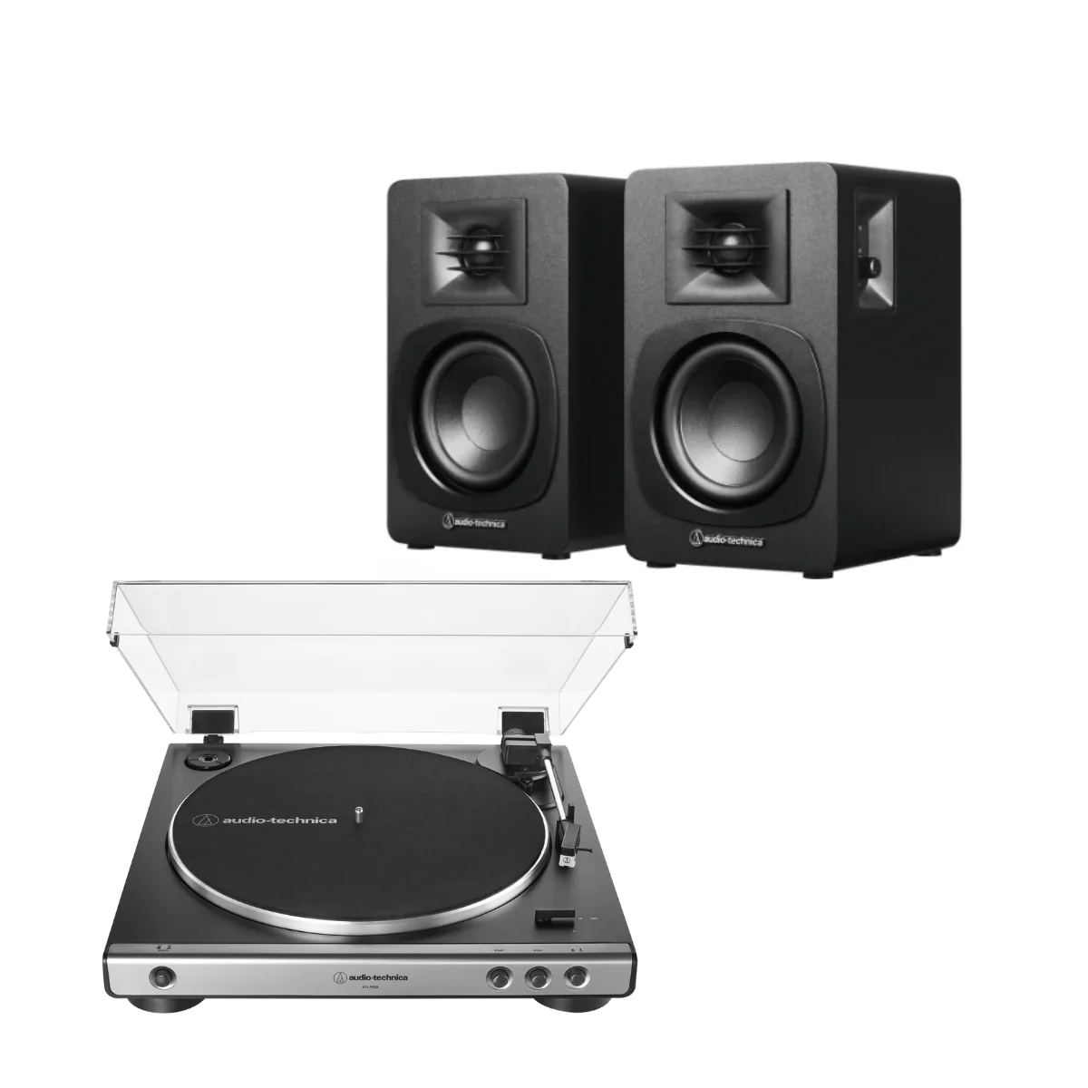 Parlantes activos de 2 vías con 30W de potencia total (15W por parlante). Diseñados específicamente para complementar la tornamesa AT-LP60X, ofrecen un sonido balanceado y cálido que realza las características del audio analógico. Conexión simple mediante cable RCA.