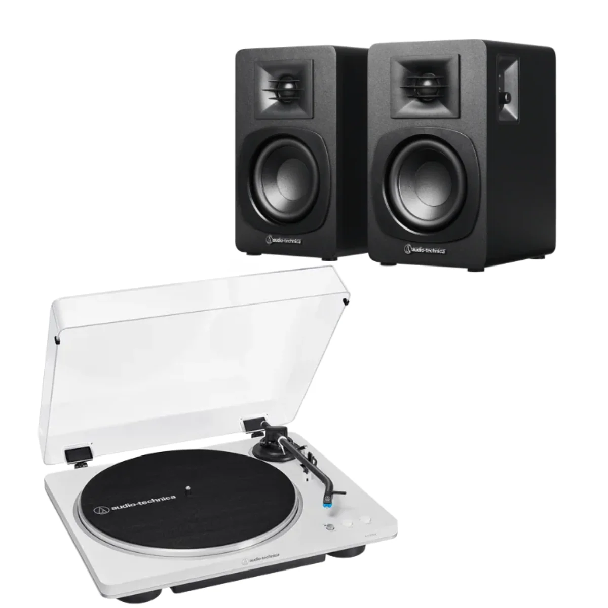 Este pack reúne la tornamesa automática AT-LP70X y los parlantes activos AT-SP3X, creando un sistema versátil que puede crecer contigo a medida que desarrollas tu oído y colección.
